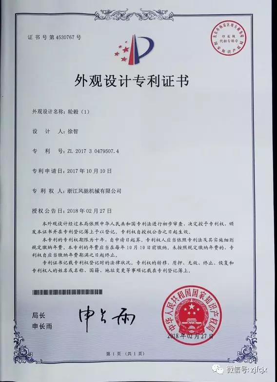 2018年2月榮獲“輪轂”外觀設(shè)計專利證書