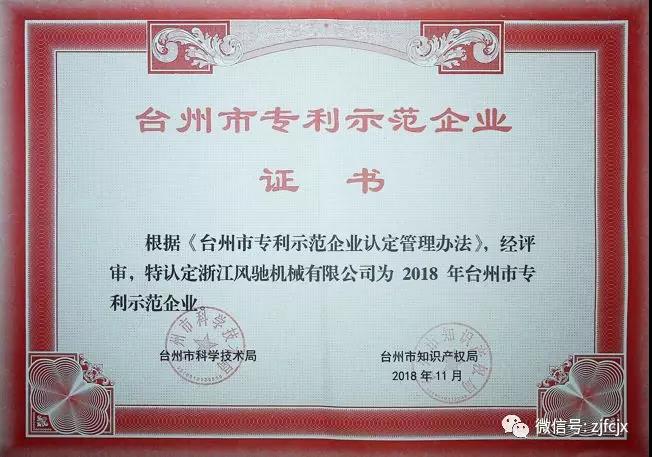 2018年11月榮獲臺州市知識產(chǎn)權(quán)局頒發(fā)的“臺州市專利示范企業(yè)”