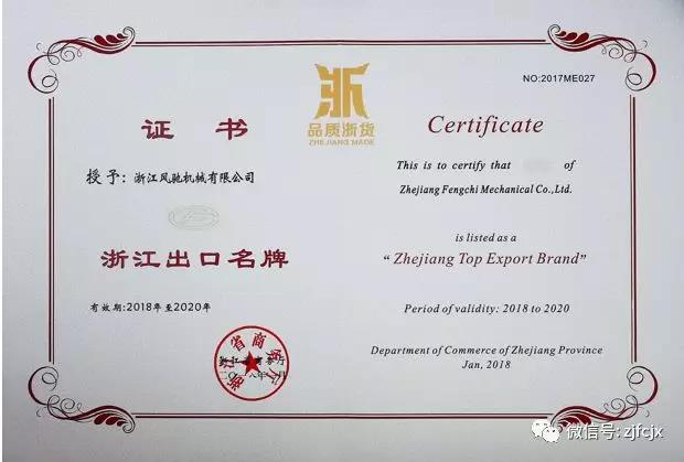 2018年1月榮獲浙江省商務(wù)廳頒發(fā)的“浙江出口名牌”